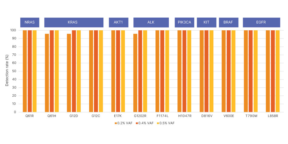 Synthetic control samples with known variant allele frequency (VAF) for each single nucleotide variant (SNV) were diluted to values ranging from 0.20%–0.50% VAF and analyzed by TruSight Oncology 500 ctDNA v2.