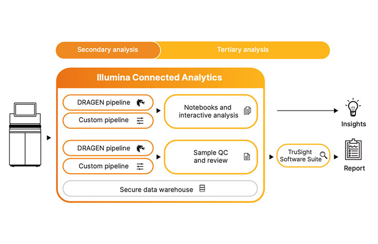 Learn how Illumina Connected Analytics offers custom pipeline development, including DRAGEN tools, secure, scalable data warehousing, and an insights generation and data science module.