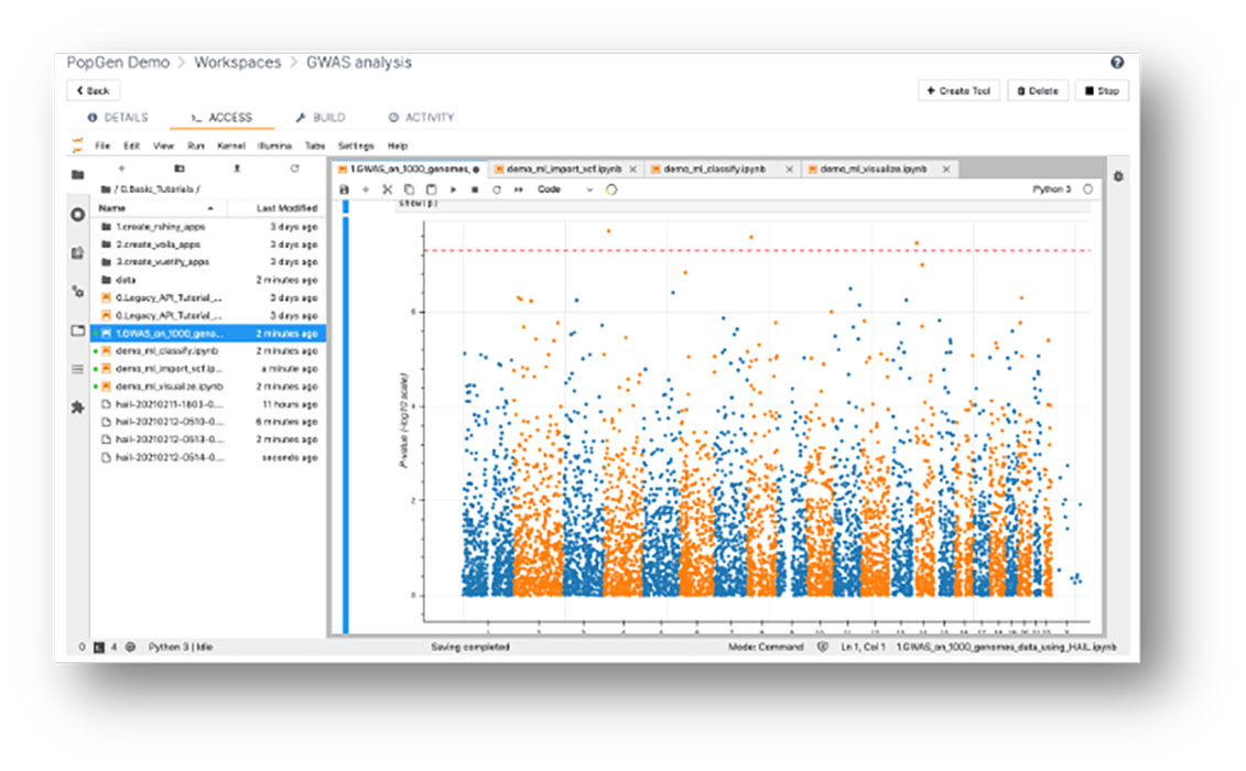 An interactive programming module, leveraging popular JupyterLab Notebooks (Python and R), Illumina Connected Analytics empowers data scientists to analyze aggregated data in a seamless and secure environment.