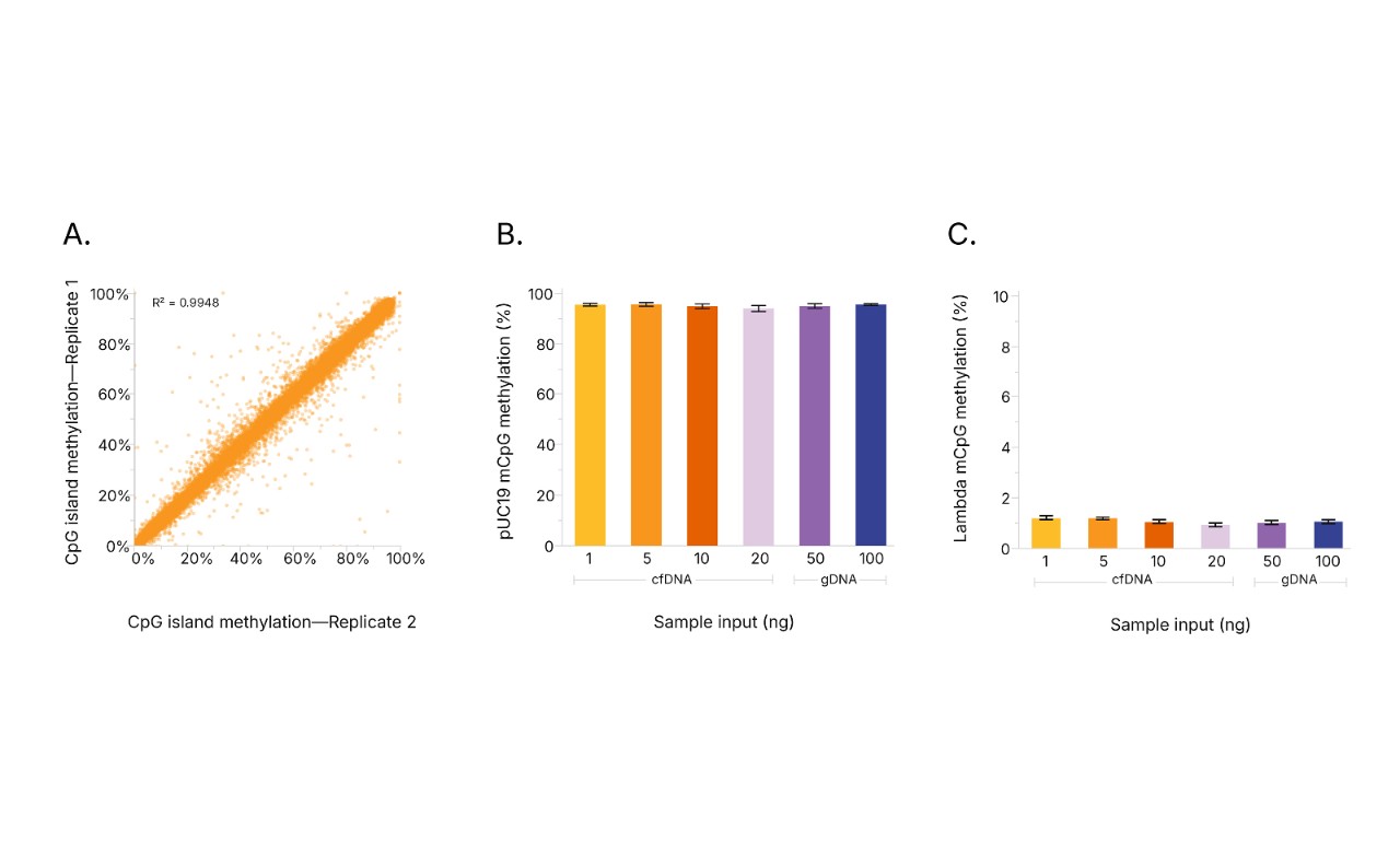 (A) Reproducible methylation detection for all CpG island regions. Highly selective 5mC conversion measured by small genome control spike-ins (B) methylated pUC and (C) unmethylated lambda. Input amounts are 1–20 ng cfDNA from healthy donors and 50–100 ng gDNA from human reference sample NA12878.