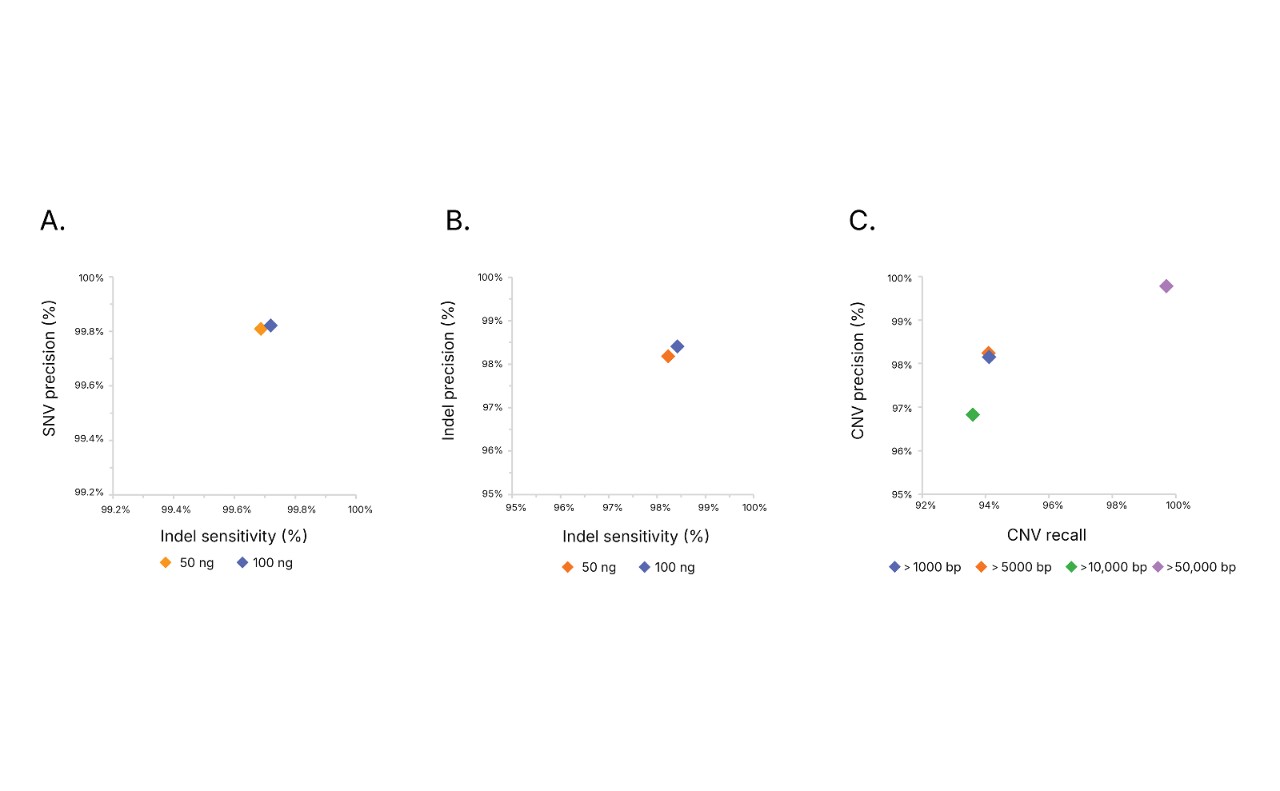 (A) Single nucleotide variant (SNV) and (B) insertion-deletion (indel) germline variant calling using Illumina 5-Base DNA Prep for 50–100 ng inputs of gDNA from human reference sample NA12878. (C) Germline CNV calling accuracy by variant size from Genome in A Bottle sample HG002.