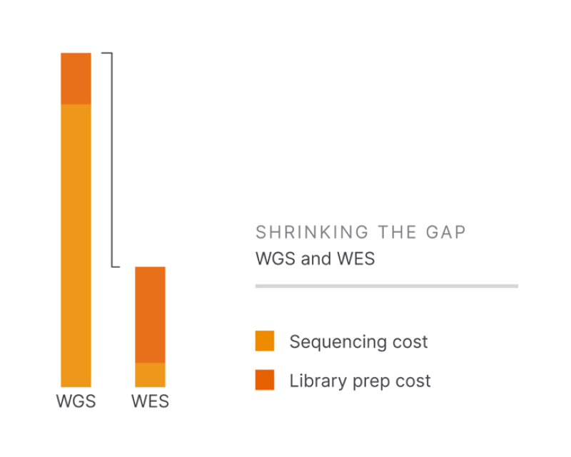 The decrease in cost/Gb on the NovaSeq X Series reduces the gap between WGS and whole-exome sequencing (WES) by over 2.5× compared to the NovaSeq 6000 System. (Based on US prices for the 25B 300-cycle kit).